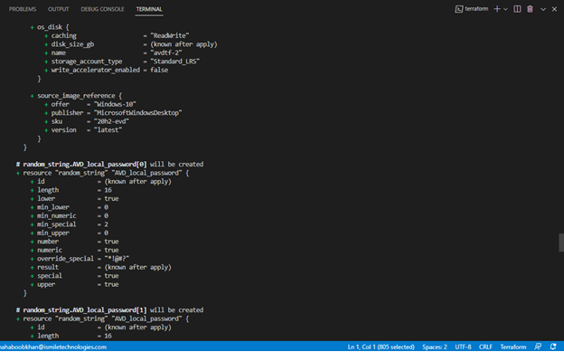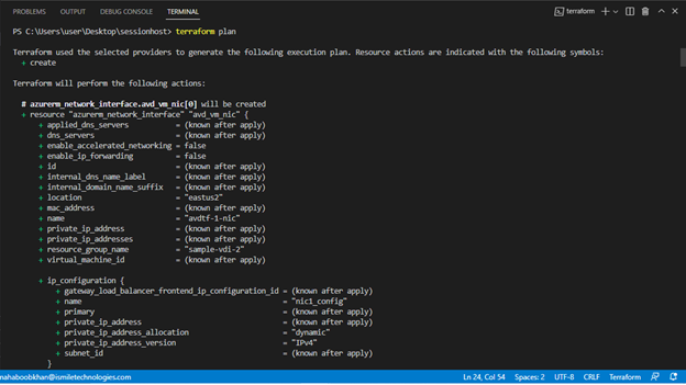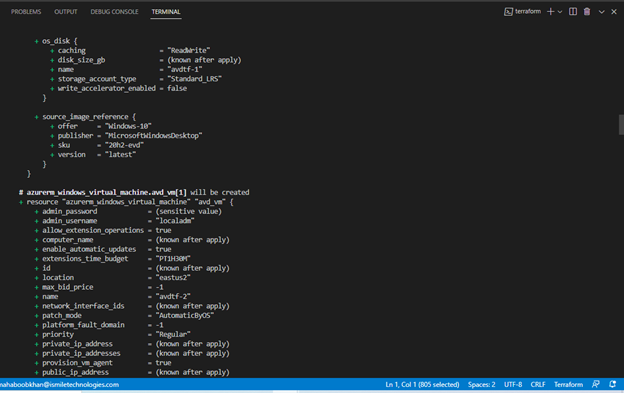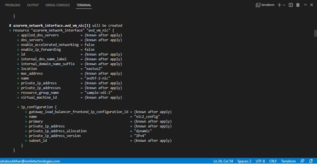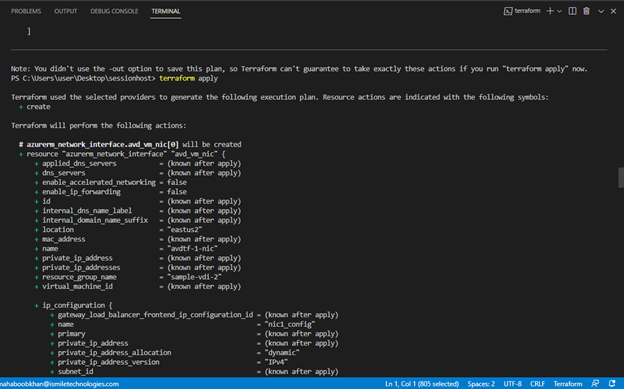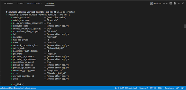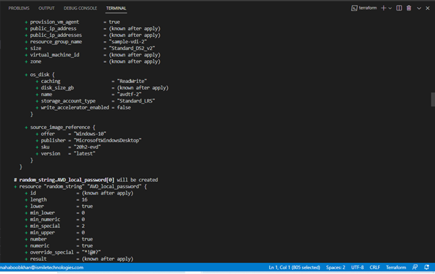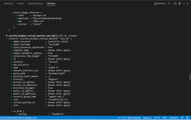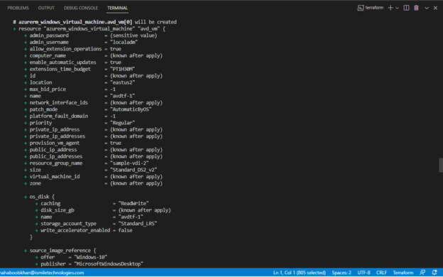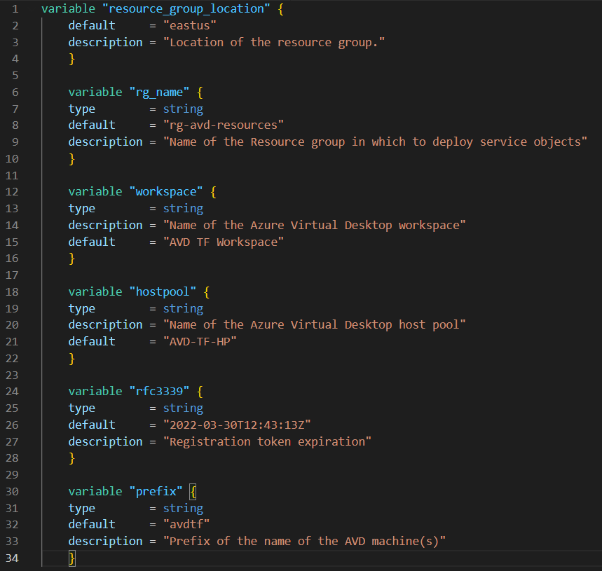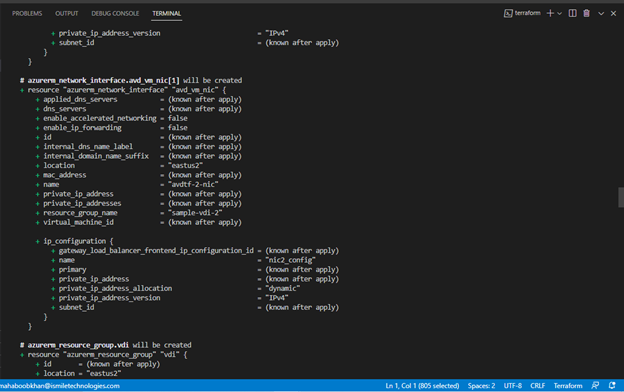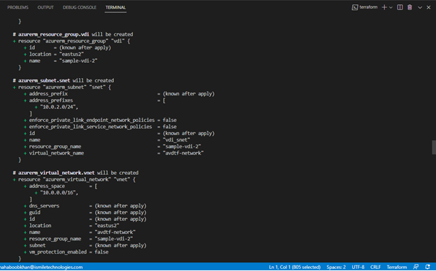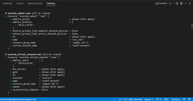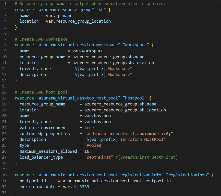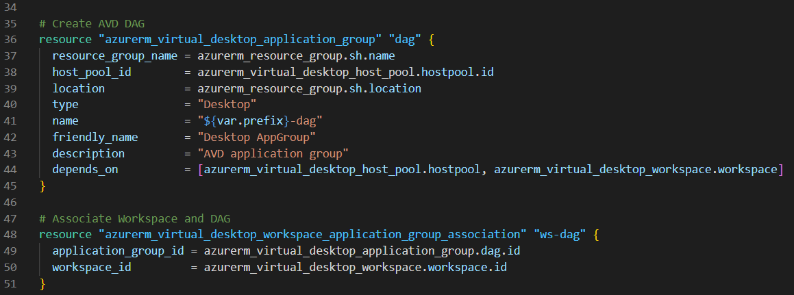 As we mentioned earlier, Terraform uses code to deploy infrastructure. Here, we can see resources by name being provisioned with configurations that we can make via code. For example, the resource “azurerm_virtual_desktop_application_group” or VDAG has