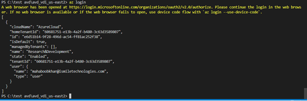 Next, you’ll need to connect your Microsoft Azure account to Terraform. Because you’ve installed the Azure CLI, you can open a terminal window and type “az login” to be prompted with instructions to sign into Azure. Upon success, you will see your account information.