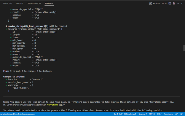 When you run “terraform apply,” you’ll see a review of the plan that Terraform intends to apply one last time and be prompted to confirm execution by typing “yes.”
