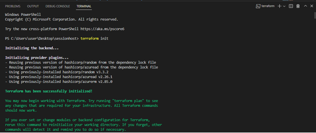 In your Windows Terminal, run “terraform init” while inside of the directory you created that hosts your four .tf files. These commands download the Azure modules required to manage the Azure resources we defined in the four .tf files from the previous step. It initializes a working directory containing Terraform configuration files.