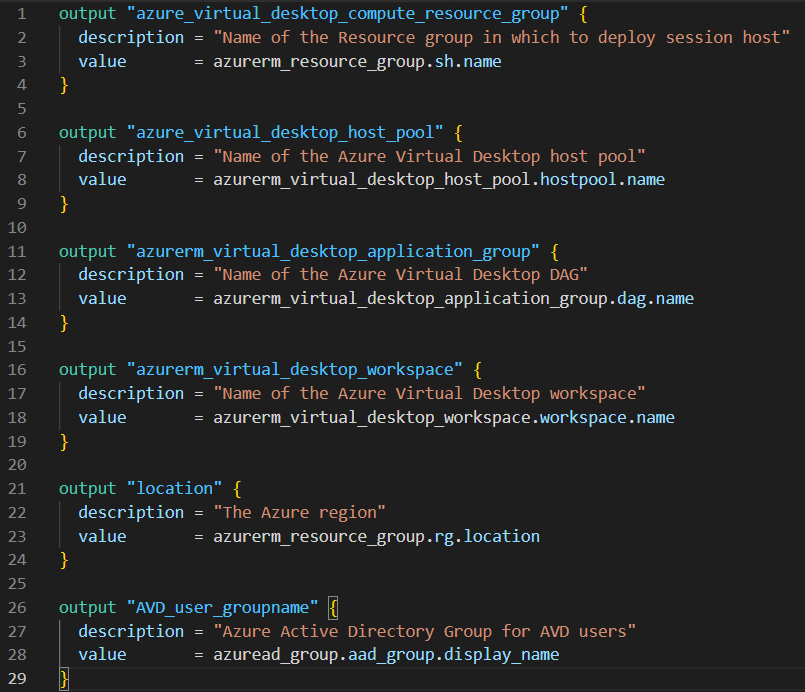 Our “output” resources have descriptions and values. The description is for a high-level understanding of what the resource intends to do, written by the developer. The value argument takes an expression whose result will be returned to the user. For example, “azure_virtual_desktop_compute_resource_group” will return a “sh.name” attribute exposed by an “azurerm_resource_group” defined elsewhere in the module.