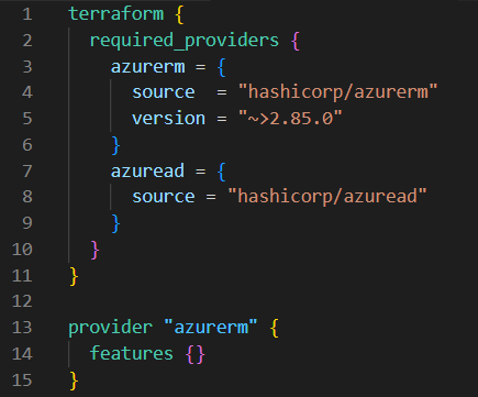 In this case, “azurerm” and “azuread” refers to Azure Resource Manager and Azure Active Directory, respectively. “hashicorp/azurerm” and “hashicorp/azuread” use HashiCorp’s repositories for necessary files for both elements.