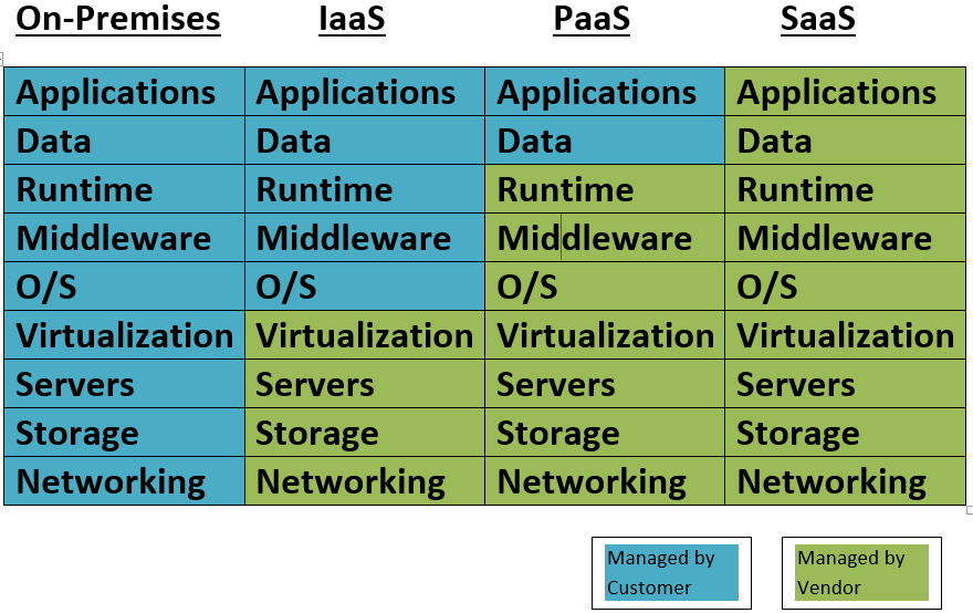 | Stands for | Infrastructure as a Service | Platform as a Service | Software as a Service |