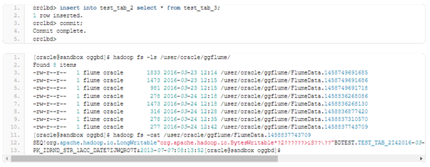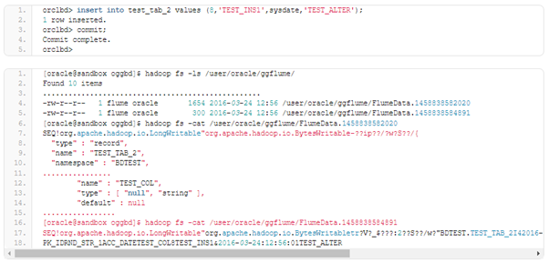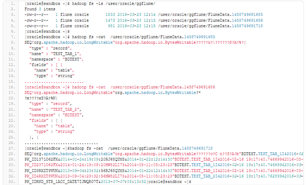 Now let’s look at the results. We have 3 files on HDFS, the first two files describe structure for the TEST_TAB_1 and TEST_TAB_2, and the third file has the data changes, or we can say initial data for those tables. It can also be seen that the schema definition was put on separate files while the data changes were put to the one file.