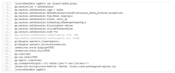 The kafka.props file needs to be adjusted to define Kafka/Zookeper topics for data and schema changes (TopicName and SchemaTopicName parameters), and the gg.classpath for Kafka and Avro java classes. The rest of the parameters is left default including format for the changes which was defined as “avro_op” in the example.
