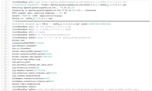 Kafka version 0.9.0.1 has been used, it has been downloading from https://kafka.apache.org/downloads.html. After downloading, it has been unpacked, and after slight configuration correction it has been started it in standalone mode.