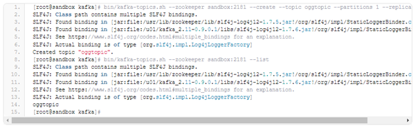 Now we must prepare our two topics for the data received from the GoldenGate. We have defined topic “oggdata” for our data flow using parameter gg.handler.kafkahandler.TopicName in our kafka.props file, and topic “mySchemaTopic” for schema changes. Now, we will create the topic using Kafka’s supplemented scripts: