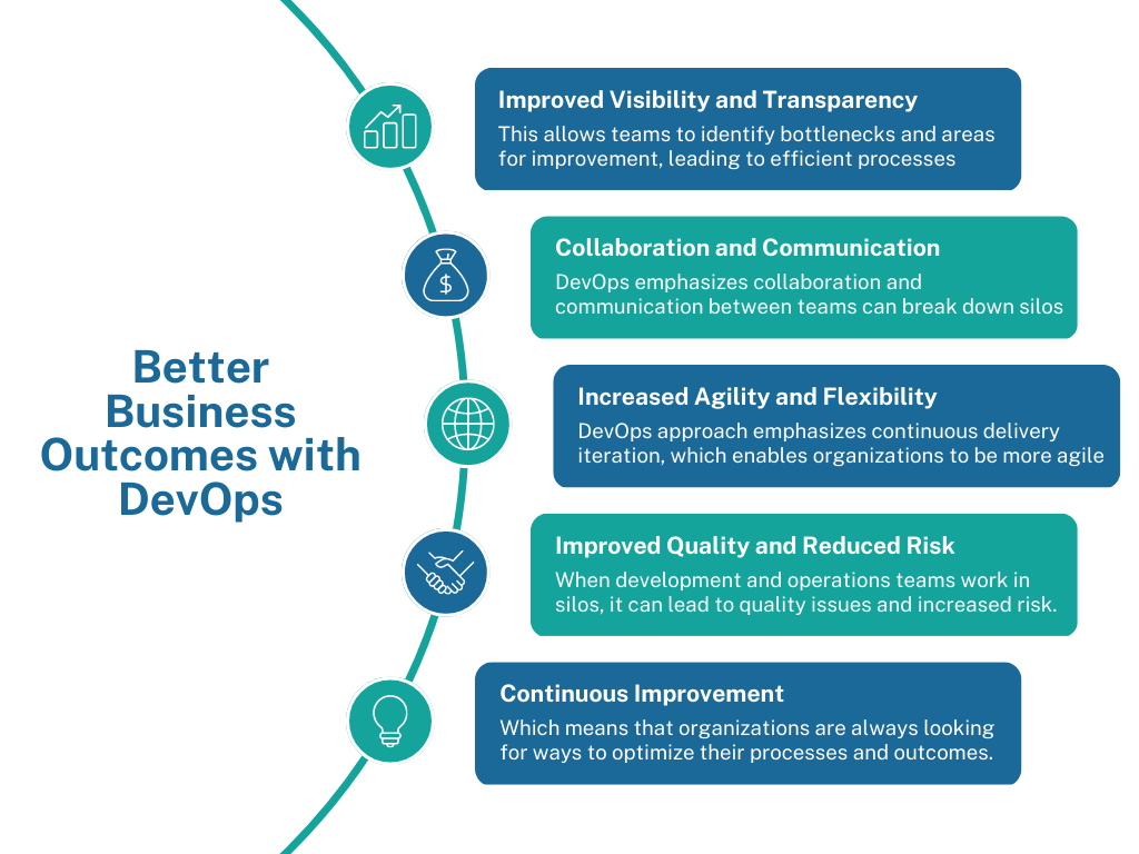 By breaking down silos and implementing a DevOps approach, organizations can achieve better business outcomes, including improved visibility and transparency, enhanced collaboration and communication, increased agility and flexibility, improved quality, better customer experience, and continuous improvement. With the help of ISmile Technologies, organizations can implement DevOps practices effectively and achieve these benefits.
