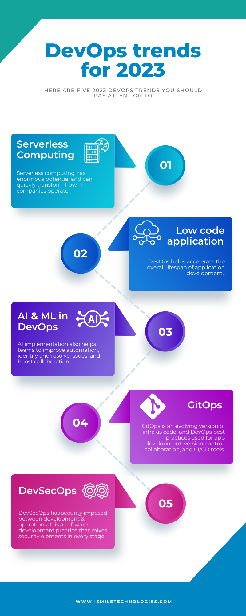 In the future, DevOps will develop further and positively impact the IT sector. New businesses are adopting DevOps technologies and methods as we speak. Above mentioned DevOps trends will help organizations to rush beyond automation and focus on high-quality deliverables. ISmile Technologies sees DevOps as a No-touch Continuous Integration/Continuous Deployment (CI/CD) driven software delivery approach. We believe it’s an approach that ensures a single integrated delivery function from requirements to production will provide higher business value to customers efficiently. Schedule your free assessment today. Schedule a free assessment today.